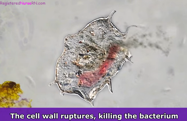 Therefore, if the peptidoglycan layer is manipulated in how it synthesizes (specifically how parts of it cross-links together), the cell wall will lose its strong protective layer and the osmotic pressure will be too intense for the cell causing it to rupture and die. Fortunately, this is exactly what we want to happen.