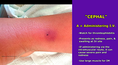 Administering IV watch for thrombophlebitis (redness, pain, and swelling at IV site) and Intramuscular injection can cause pain and redness at the site….use a large muscle for IM administration.