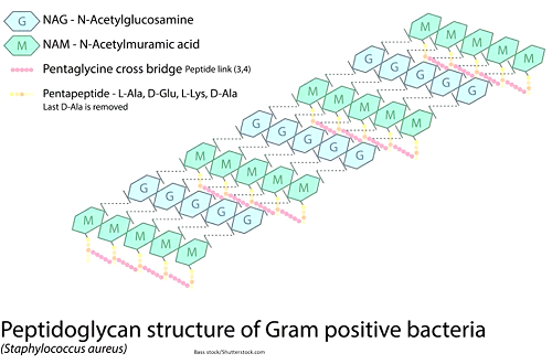 Peptidoglycan is a polymer made up of a network of polysaccharide strands (hence sugars) and amino acids. These strands consist of N-acetylglucosamine (NAG) and N-acetylmuramic acid (NAM), which stack beside each other.